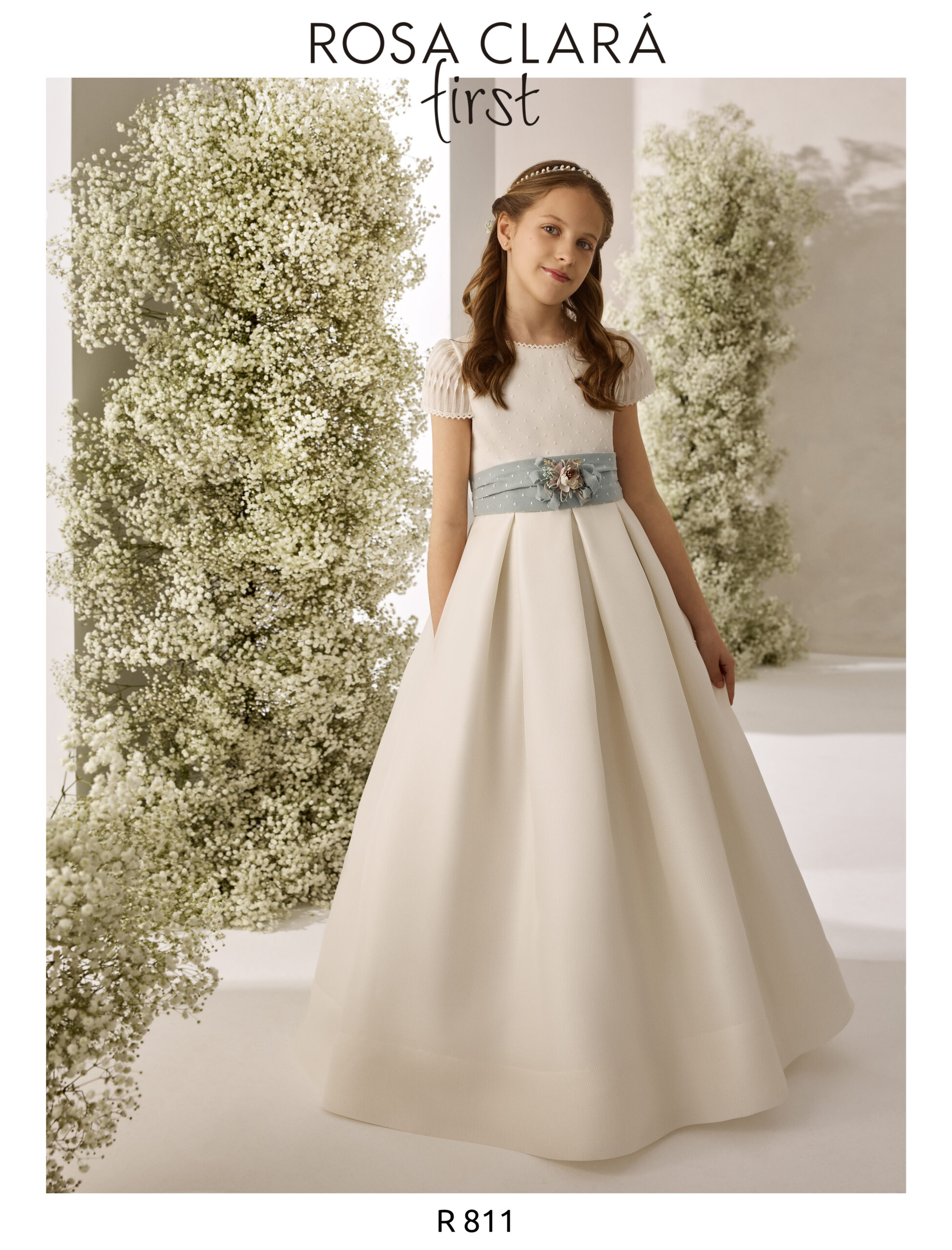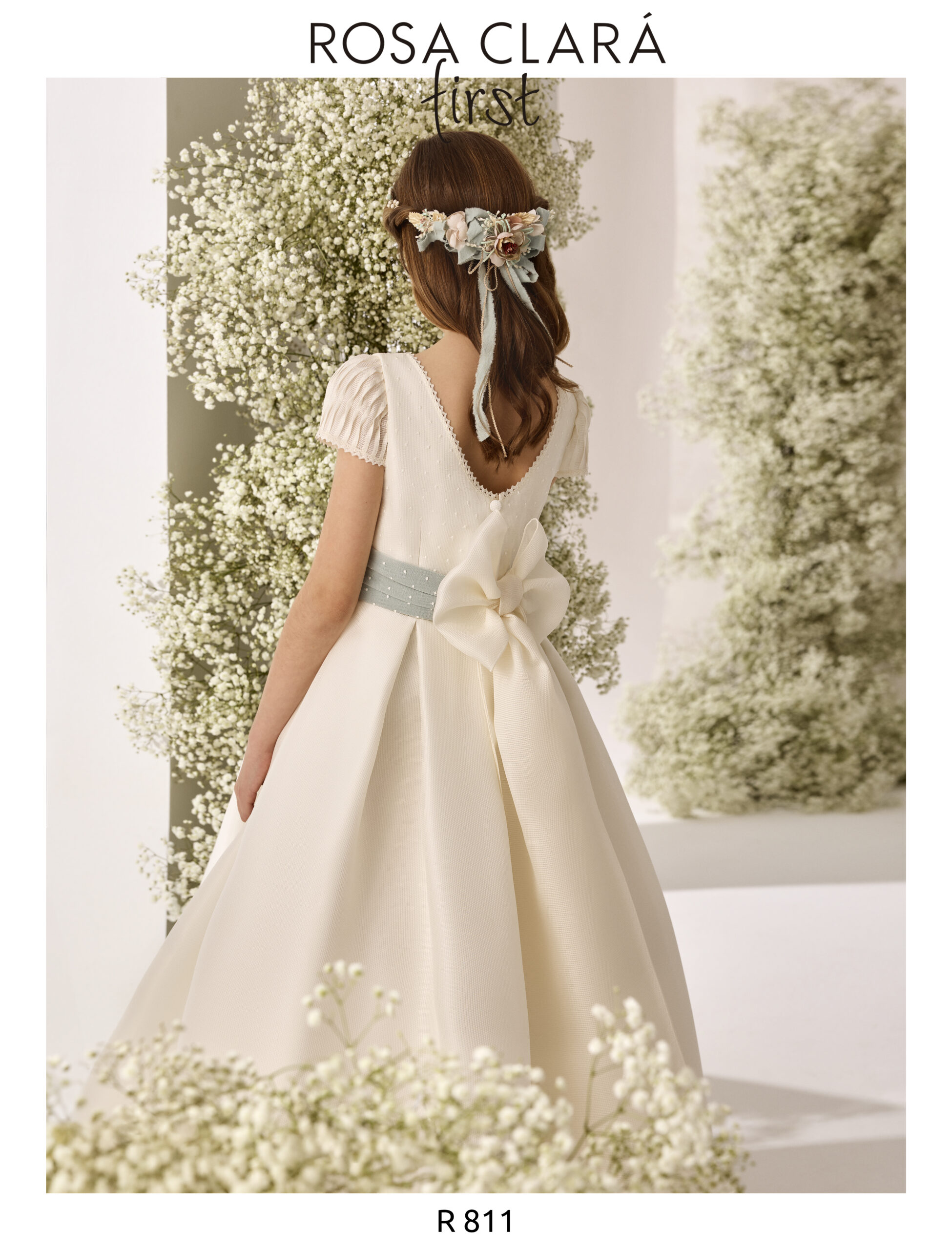 Vestido de comunión de manga corta en esterilla de poliester con fajin en plumeti.