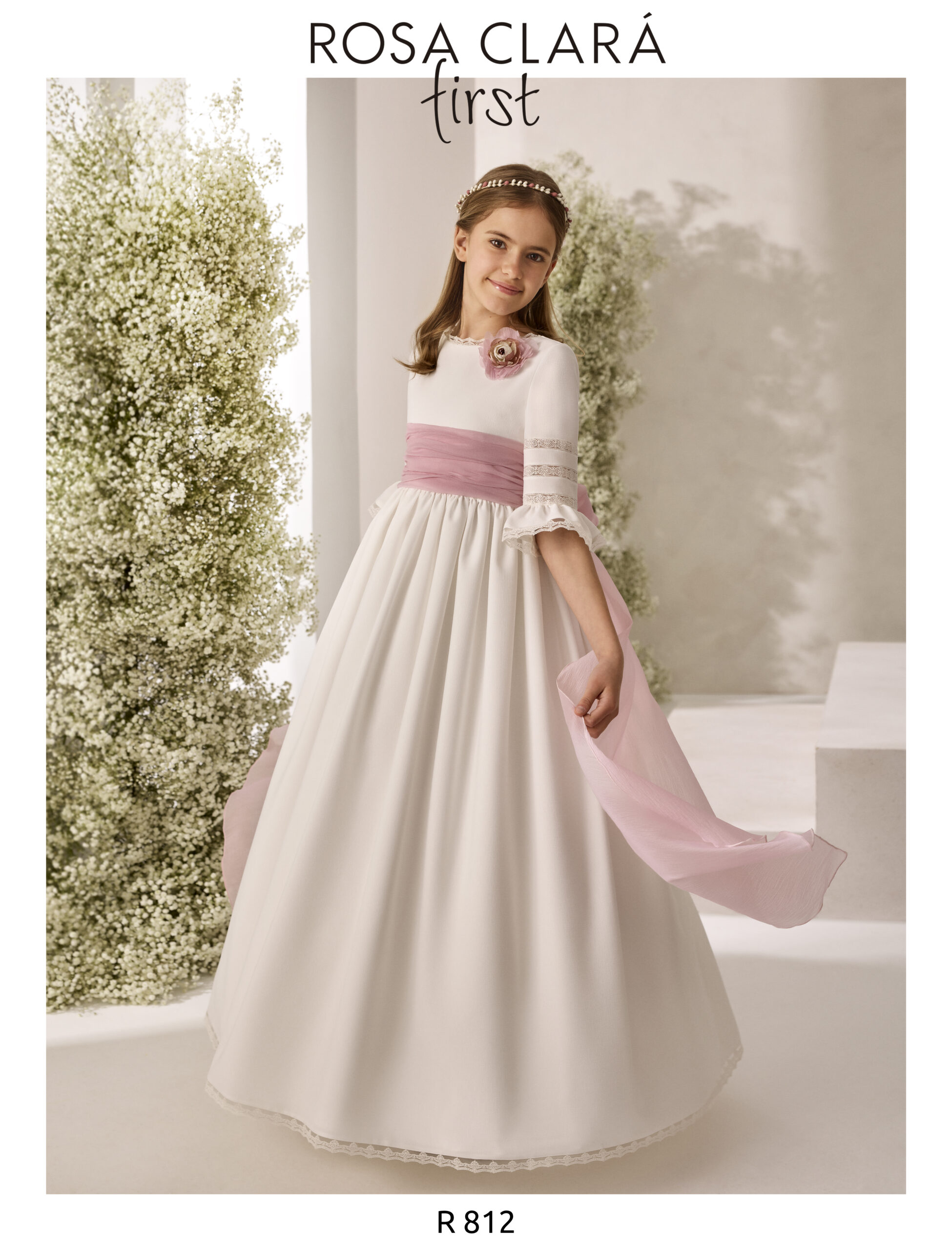 Vestido de comunión con manga al codo de crepé con adornos en rosa fuerte.